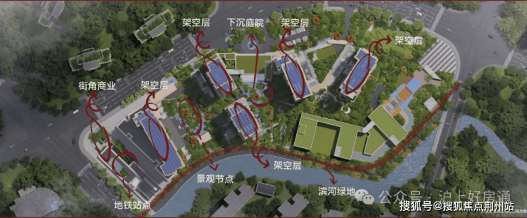 更重要的是,抬升让社区与四周环境产生新的互动:接近的河道,因地形提高,天然构成对外的景象屏障与观景天台,站在社区内可居高赏河;而社区外看不到内部日子,隐私与景象兼得.